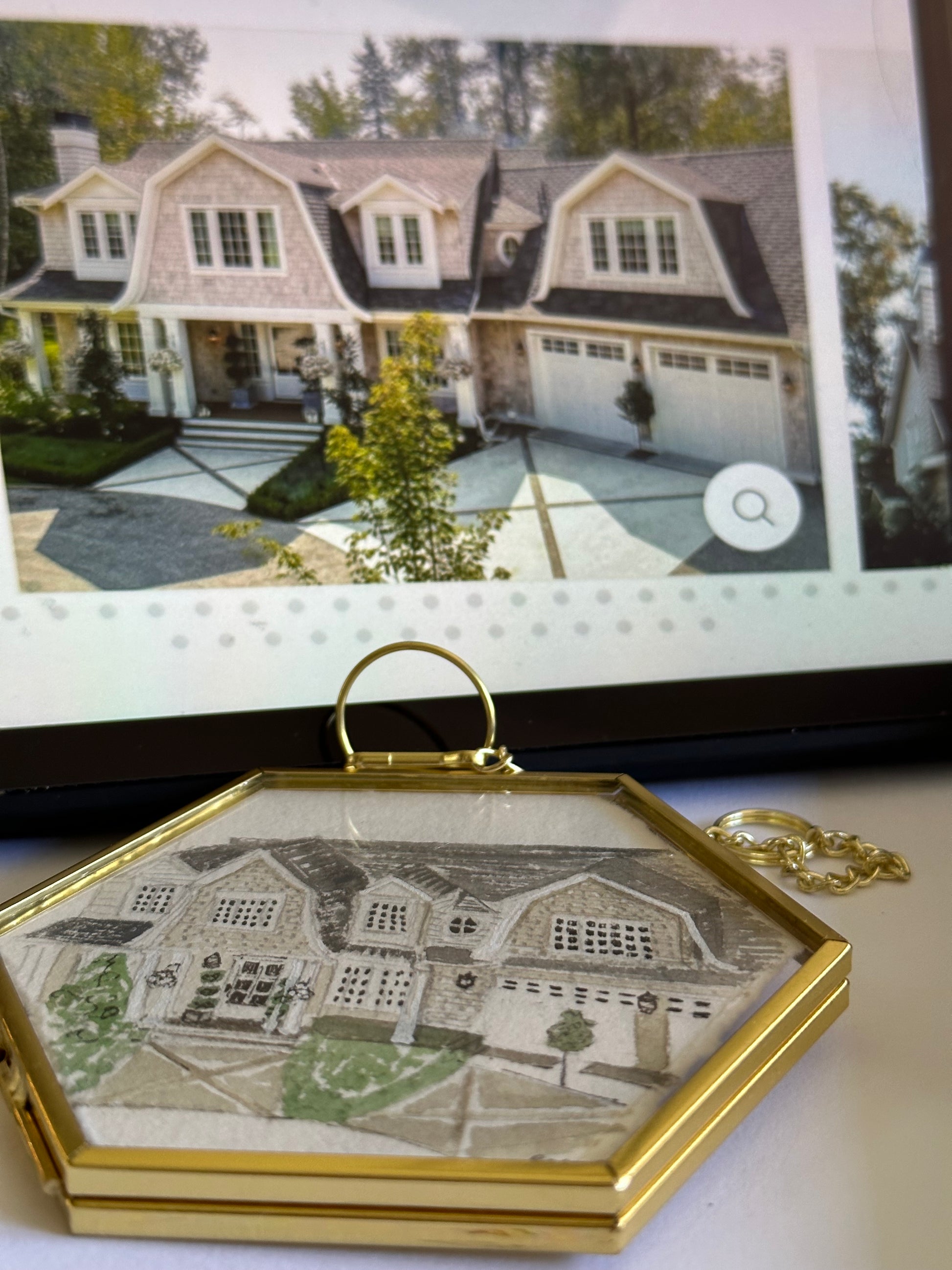 This is a purchase for a custom watercolor home portrait (your home) in a mini gold hexagon ornament style frame with a raw edge chiffon ribbon, and  a Polka dot, signed back. Ships in a secure bubble wrapped box via USPS with tracking. Be sure to DM me your home with in Instagram, a clear photo with all the details and information for your portrait. Need a round mini view our custom hand painted round mini house ornament