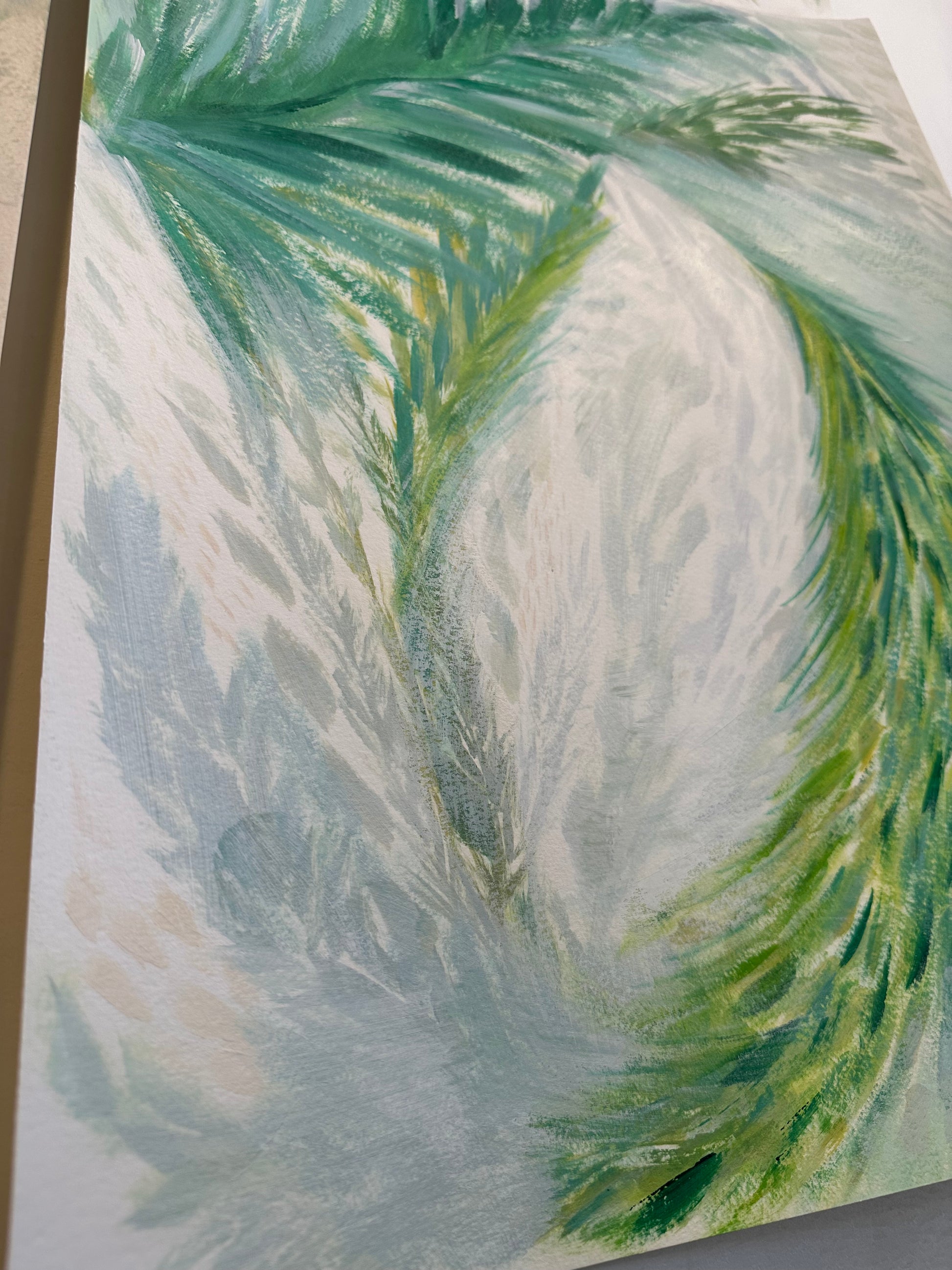 This painting has lots of brush strokes, filled with shades of green, and mint blue, some neutrals  in my whimsical flair of brushstrokes while creating texture. Using my favorite palette knife to create this composition and movement as the paint skips along the paper. This is on GSM 100% bright white watercolor paper in a standard size 18” x 24” for easy framing,signed,ships flat via USPS with tracking.