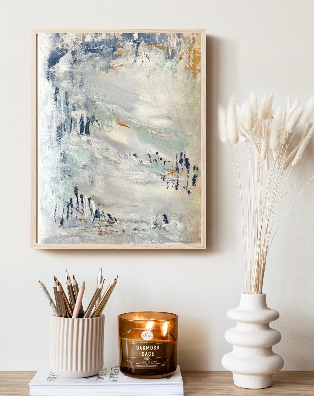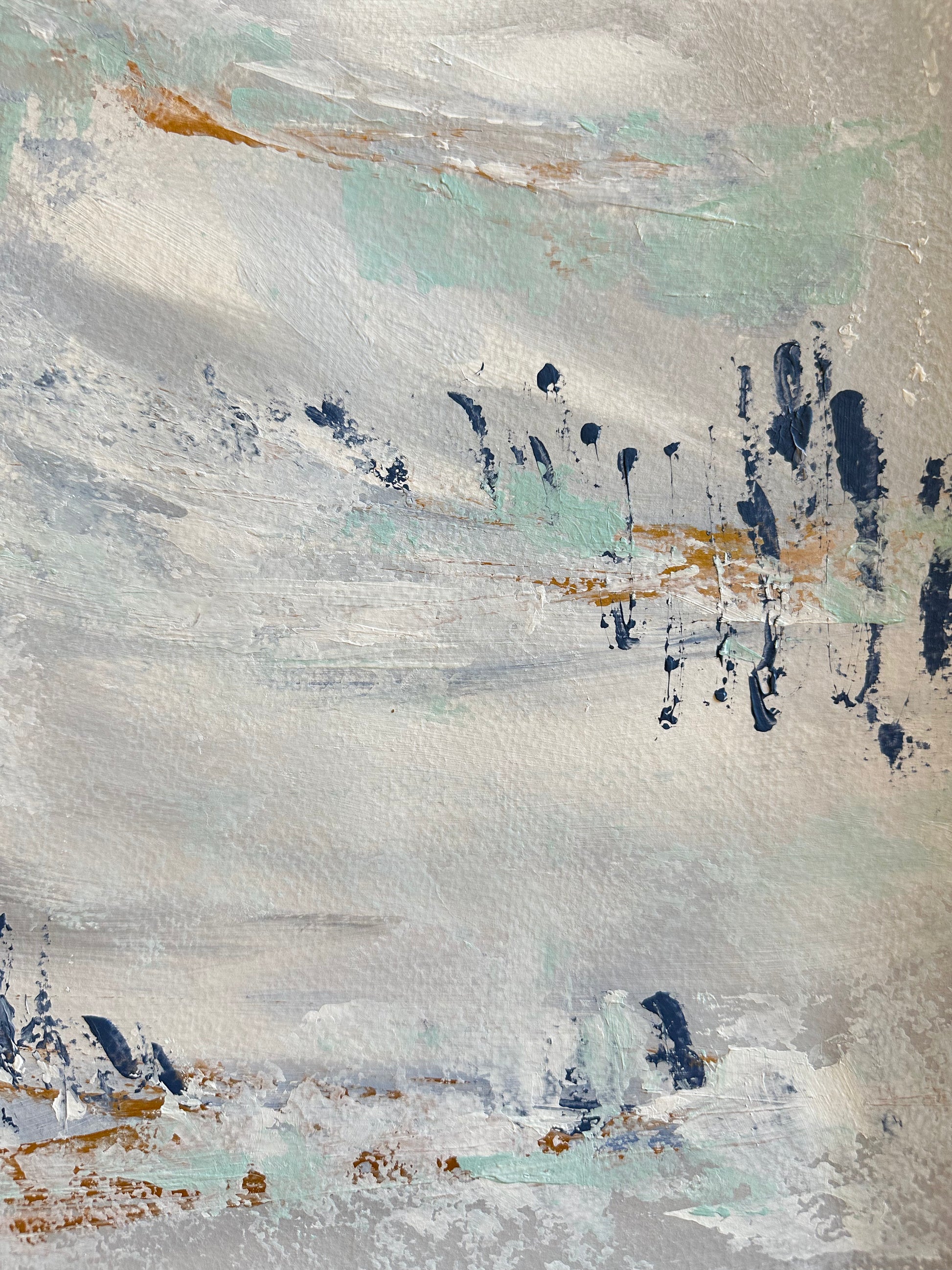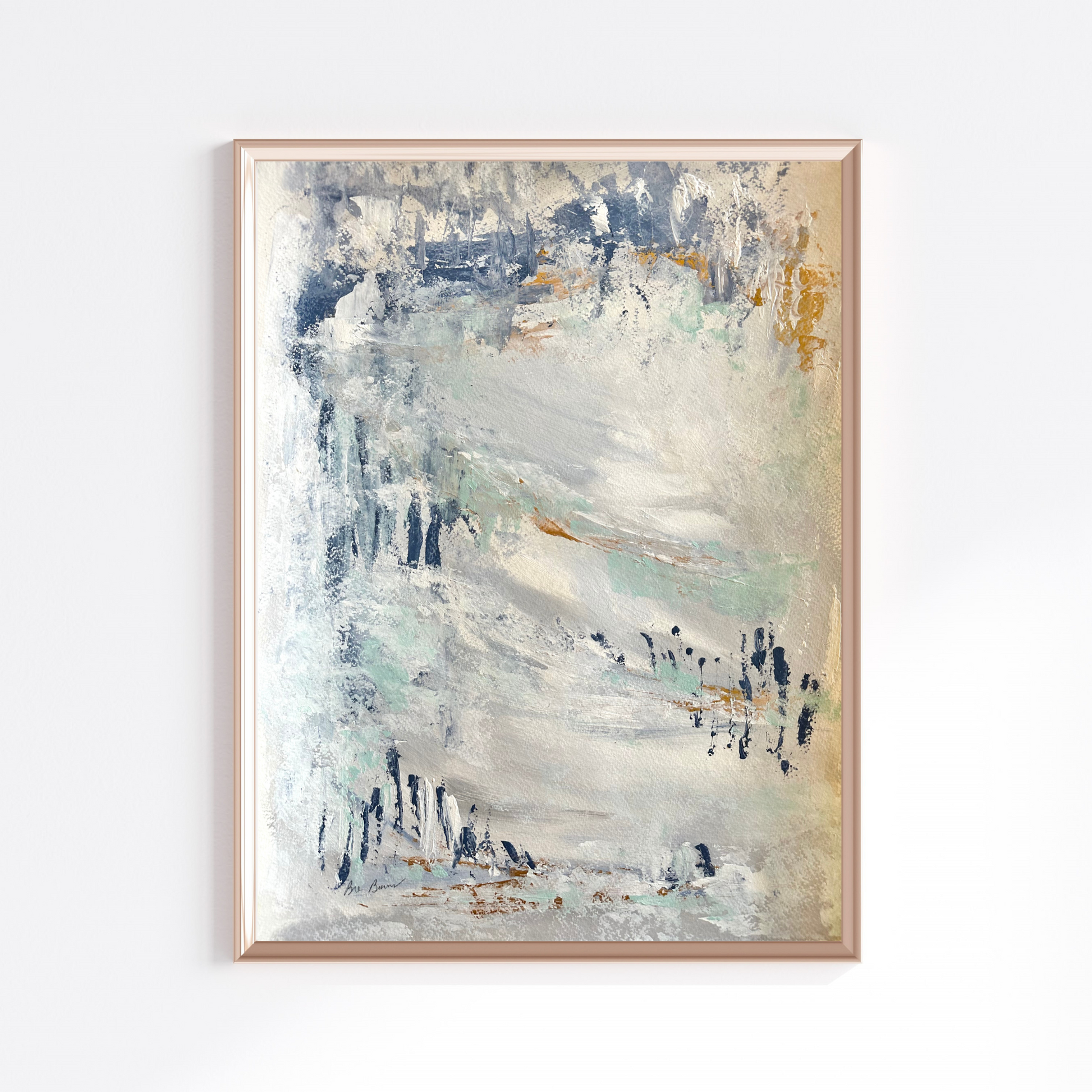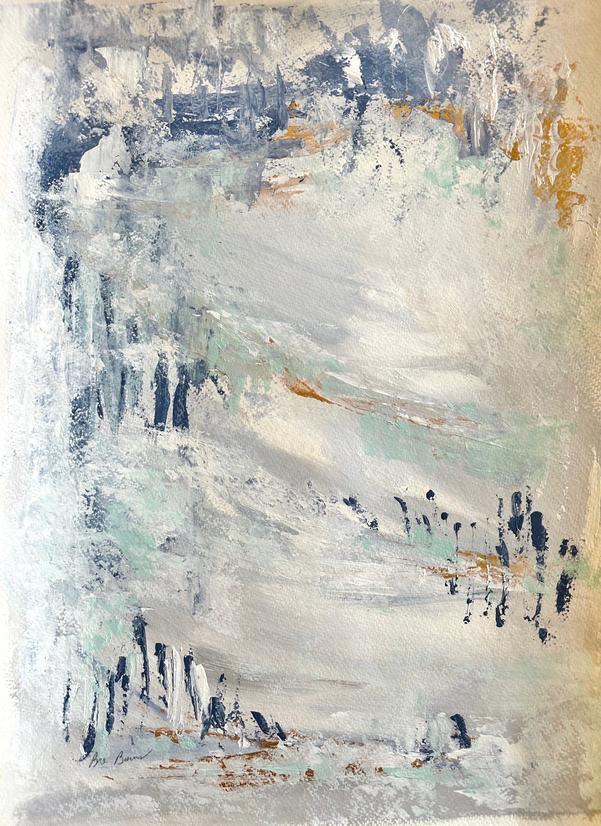A creative painting with movement and brush strokes creating wonderful layers and details. This is a piece that can stand alone or be featured above a bed or in an office. It can be paired with a similar piece in the series or a compliment painting. This is signed and painted on standard 18" x 24" bright white GSM watercolor paper perfect for framing.