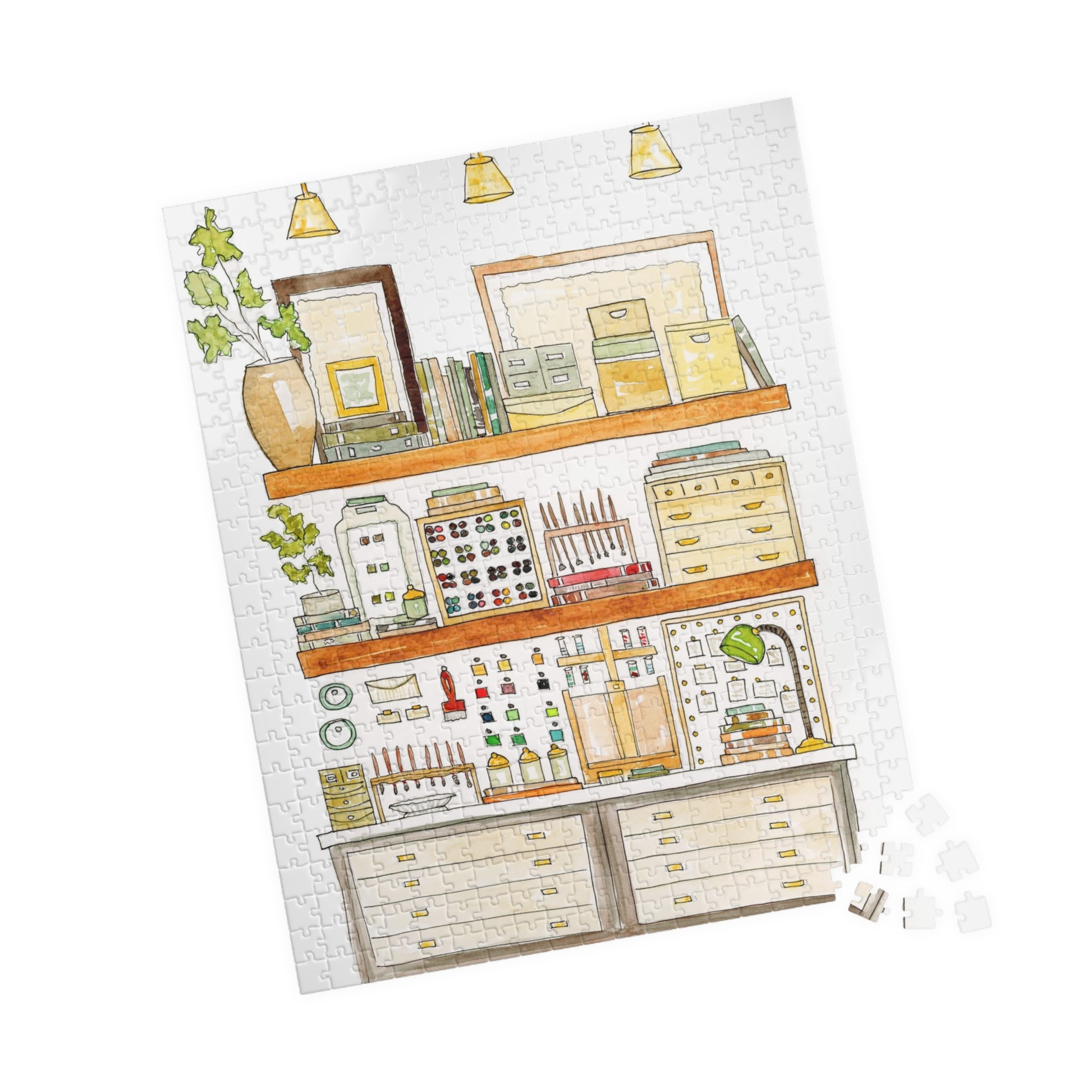 Immerse yourself in the calming atmosphere of an art studio with this watercolor illustration puzzle. Perfect for art enthusiasts and those who enjoy a fun and relaxing challenge. Ideal for gifting during holidays, birthdays, or as a thoughtful way to show appreciation. This is a one of a kind puzzle from a whimsical watercolor interior illustration.